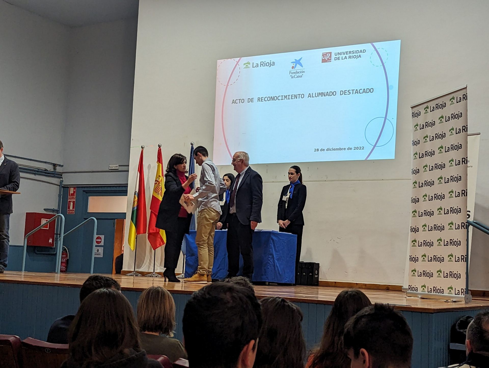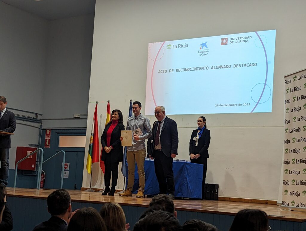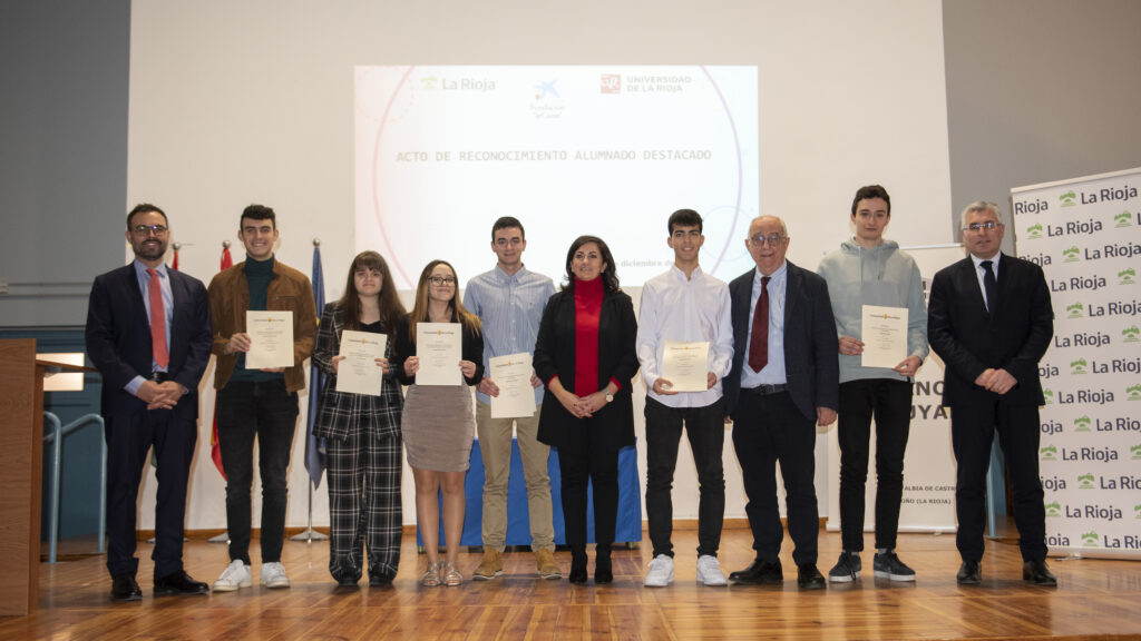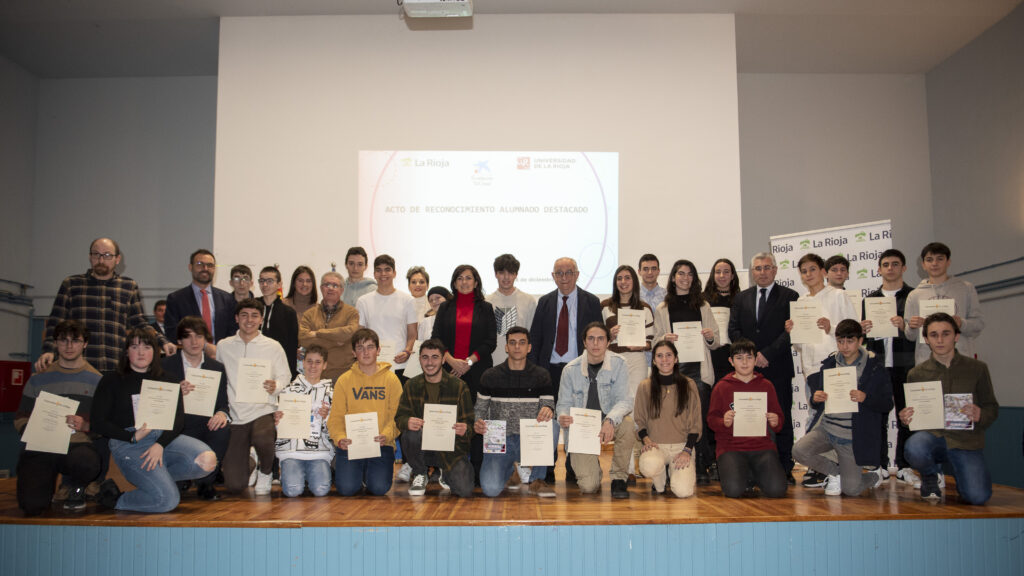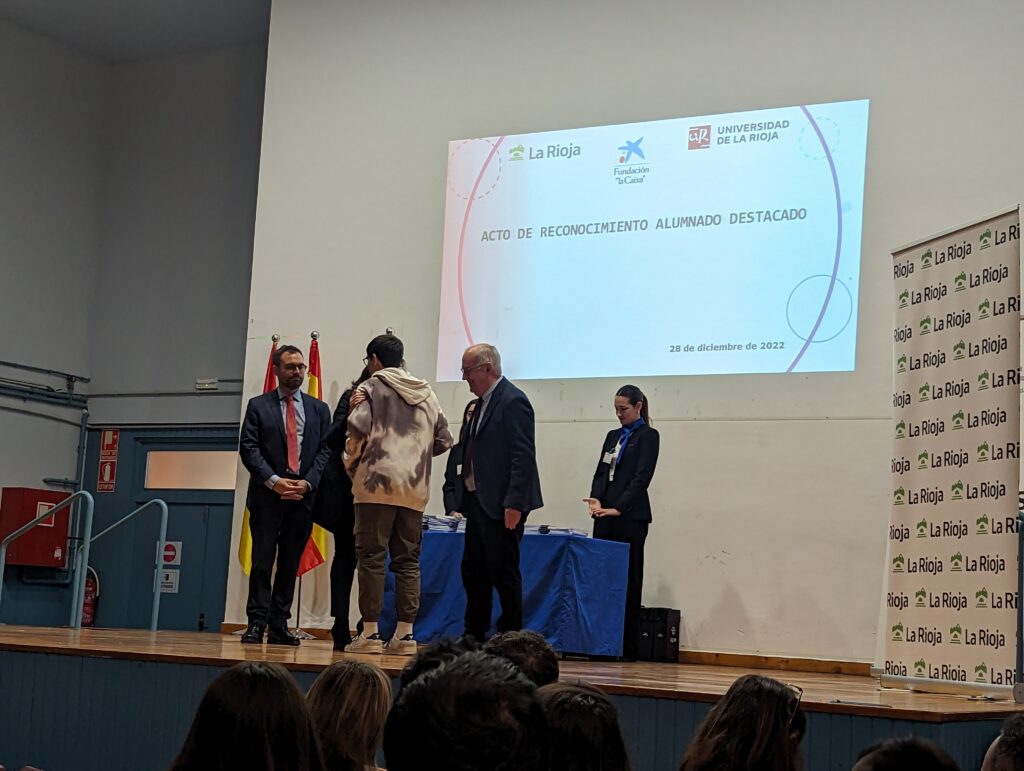 Hoy 28 de diciembre se ha celebrado en el Salón de Actos del IES D’Elhuyar de Logroño el Acto de Reconocimiento a Alumnos Destacados y Excelencia Académica del curso 2021 – 2022. El evento ha estado presidido por la Presidenta de la Comunidad Autónoma de La Rioja, Concha Andreu, acompañada por los Consejeros de Educación, Cultura, Deporte y Juventud, Pedro Uruñuela y Desarrollo Autonómico, José Ángel Lacalzada; así como de los Directores Generales de Innovación Educativa, Alberto Abad; FP Integrada, Félix Alonso, y Universidad y Política Científica, Pilar Vargas.
