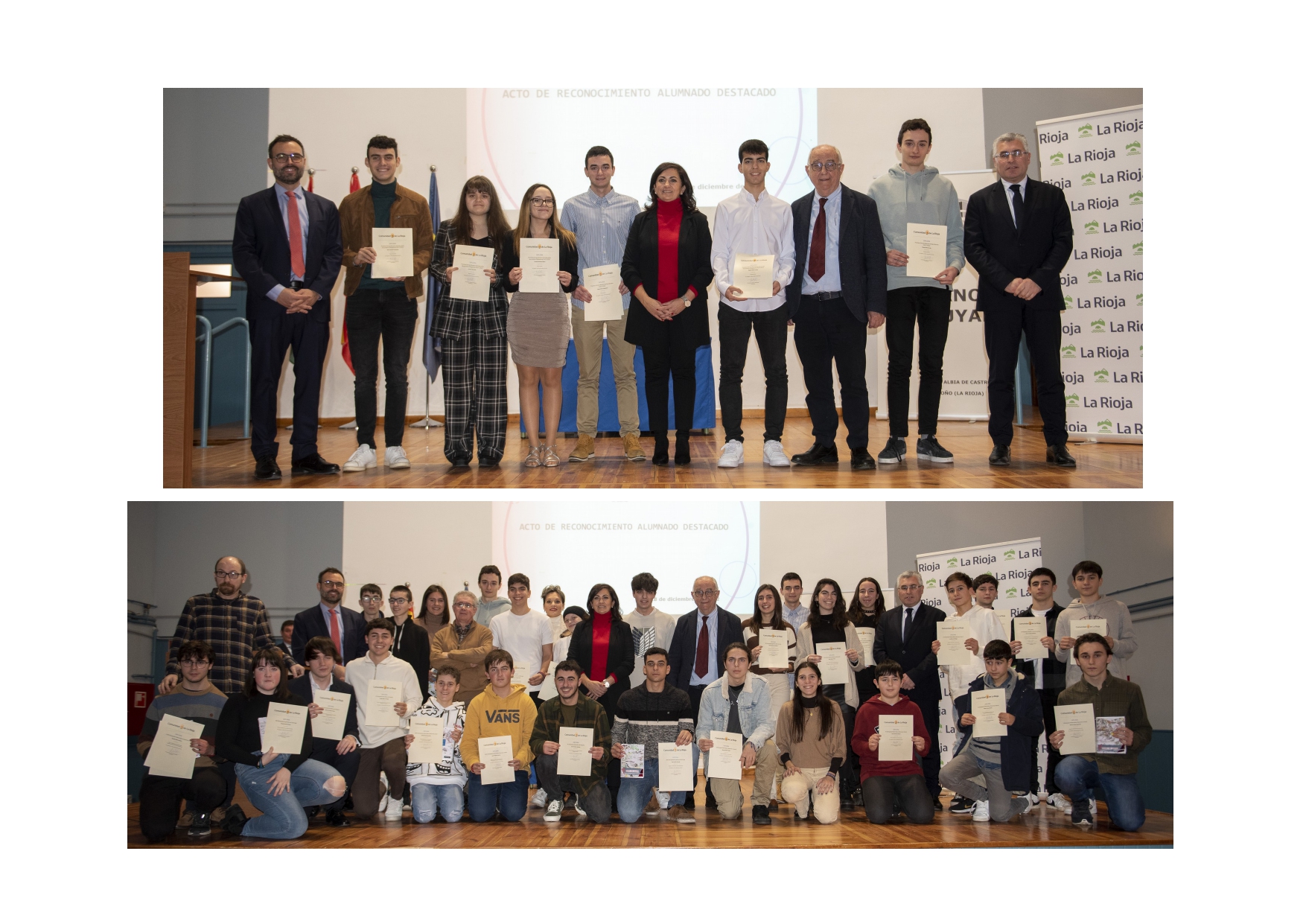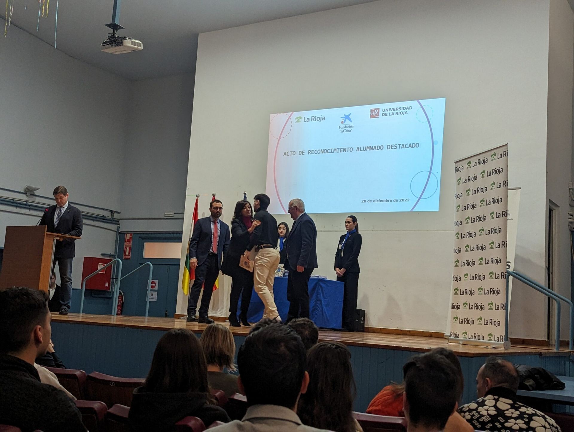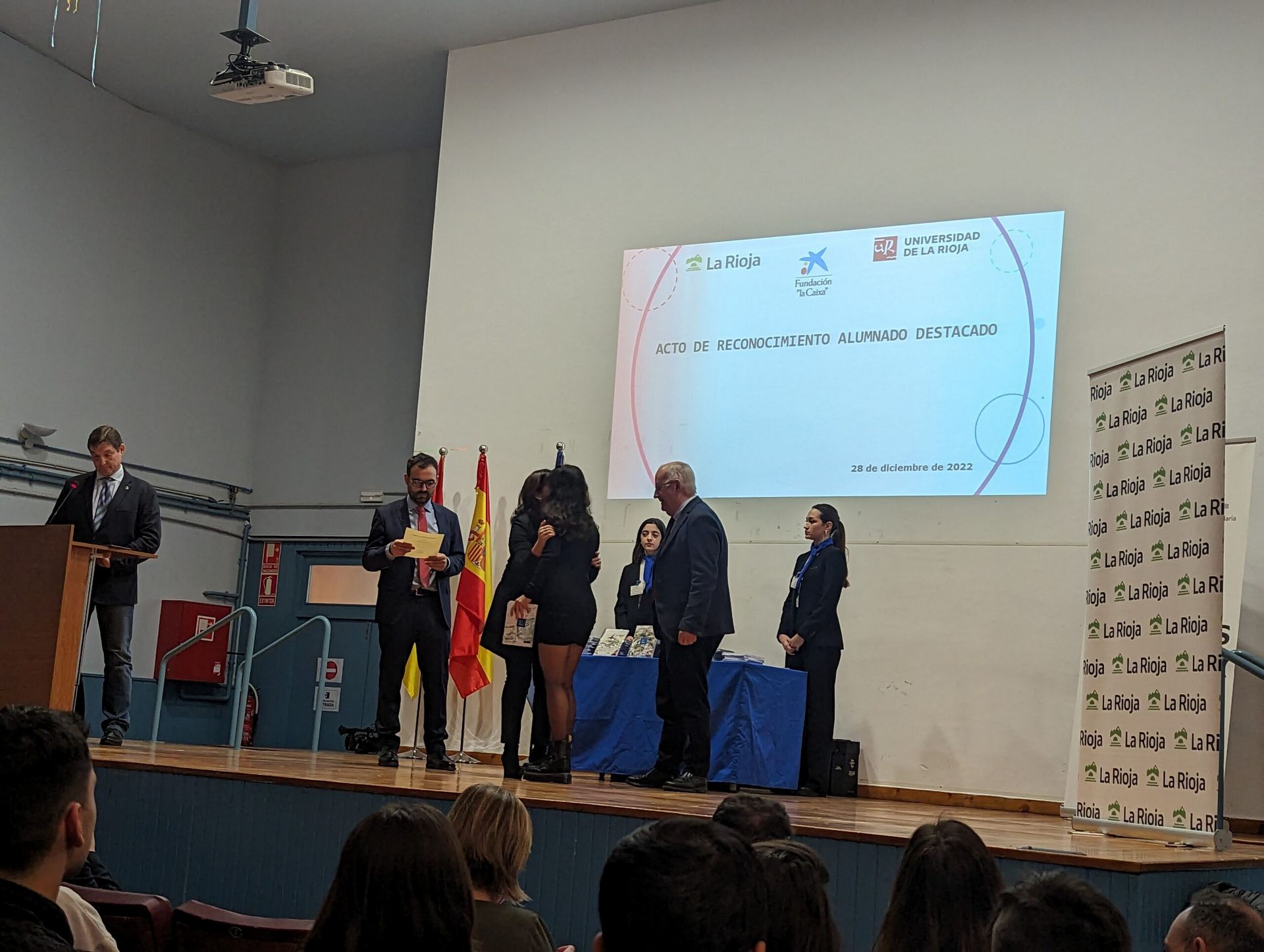Hoy 28 de diciembre se ha celebrado en el Salón de Actos del IES D’Elhuyar de Logroño el Acto de Reconocimiento a Alumnos Destacados y Excelencia Académica del curso 2021 – 2022. El evento ha estado presidido por la Presidenta de la Comunidad Autónoma de La Rioja, Concha Andreu, acompañada por los Consejeros de Educación, Cultura, Deporte y Juventud, Pedro Uruñuela y Desarrollo Autonómico, José Ángel Lacalzada; así como de los Directores Generales de Innovación Educativa, Alberto Abad; FP Integrada, Félix Alonso, y Universidad y Política Científica, Pilar Vargas.