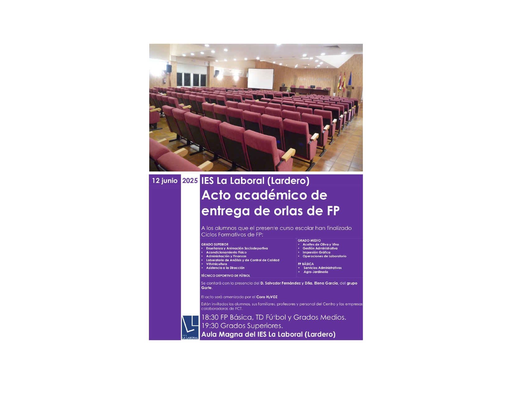 El próximo jueves 12 de junio celebraremos los Actos de Graduación de Formación Profesional en el Salón de Actos del centro, que contarán con la presencia de D. Salvador Fernández y Dña. Elena García, del Grupo Garte, y que tendrán el siguiente horario:
