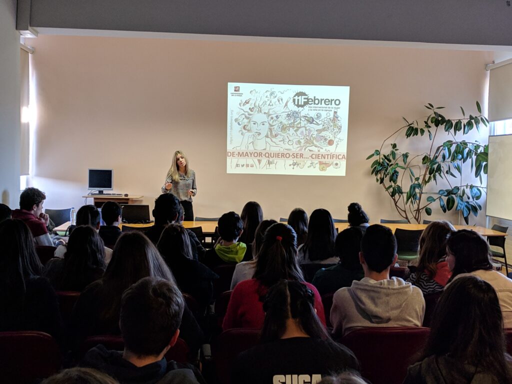 Los alumnos de 3º ESO, 4ºESO y 1ºBachillerato han asistido hoy a las dos charlas que ha impartido la profesora Beatriz Pérez Valle, investigadora del Departamento de Matemáticas y Computación de la Universidad de La Rioja, sobre el papel de la mujer en la ciencia a lo largo de la historia y su tradicional discriminación. La ponente ha promocionado algunos estudios universitarios de carácter científico que no son cursados habitualmente por mujeres y ha animado a las alumnas a escogerlos. La charla se enmarca en el ciclo de conferencias que se están impartiendo en los Centros de Educación Primaria y Secundaria de La Rioja para conmemorar el Día Internacional de la Mujer y la Niña en la Ciencia.