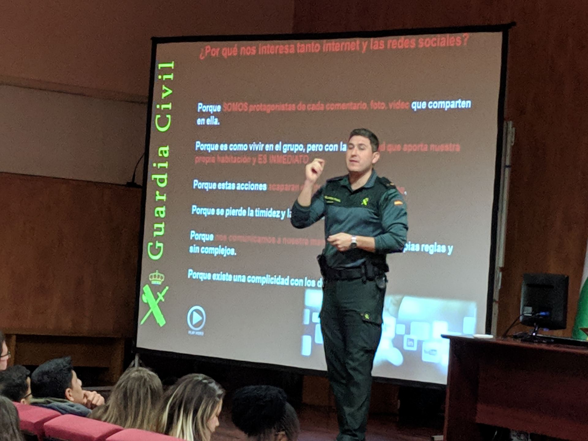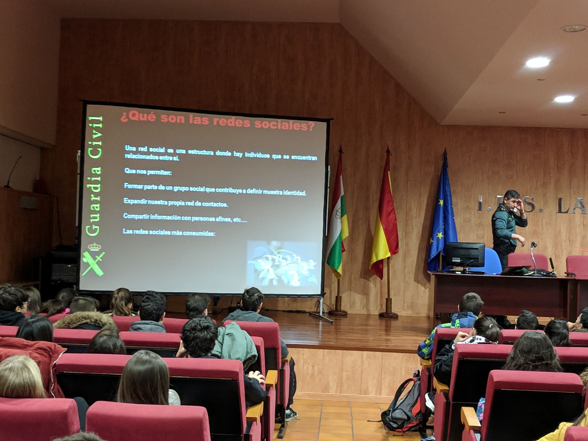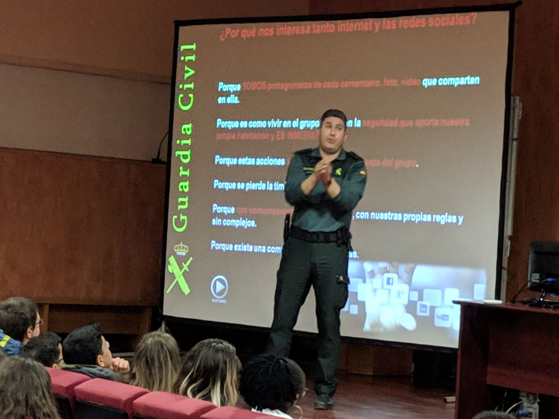 Esta mañana los alumnos de 3º ESO han asistido a una charla sobre Riesgos de Internet impartida por la Guardia Civil, en la que se han analizado los usos de Internet, las redes sociales más comunes entre los adolescentes, así como los peligros que entraña una utilización negligente de las mismas. Agradecemos a la Guardia Civil su implicación en la labor de concienciación sobre los riesgos que comportan ciertos hábitos en la red.