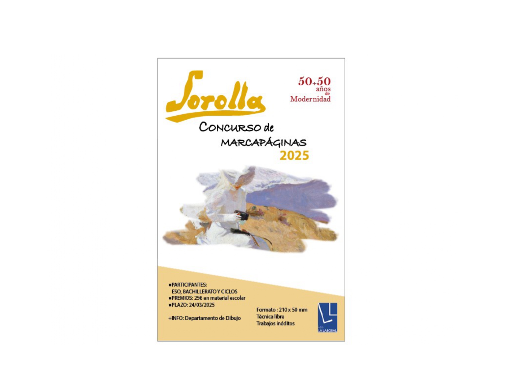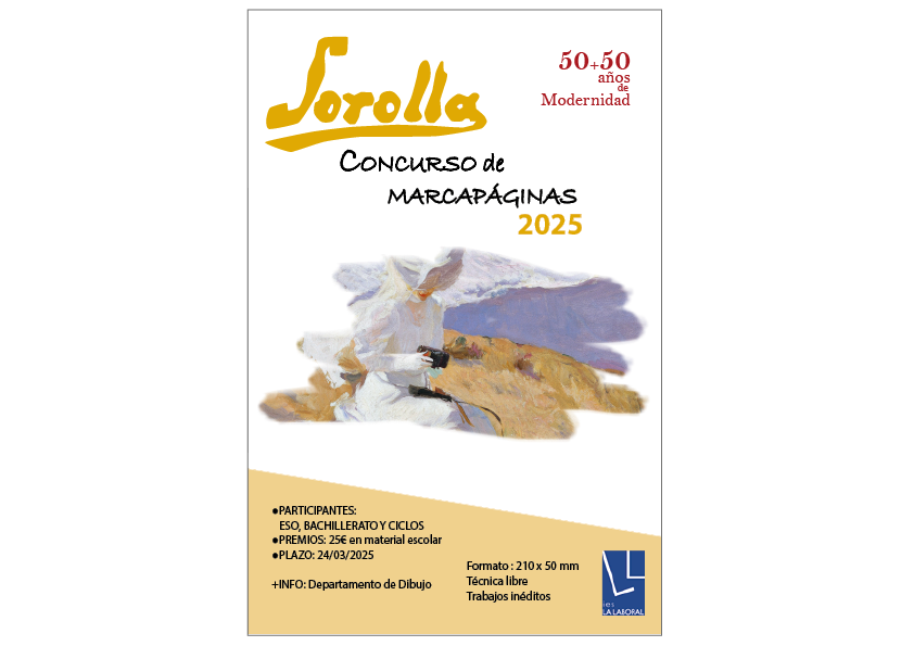 Como cada año el Departamento de Artes Plásticas organiza el Concurso de Marcapáginas del IES La Laboral. Coincidiendo con el 50 aniversario de nuestro centro, este curso el tema propuesto es «SOROLLA, 50+50 AÑOS DE MODERNIDAD». Rendimos así homenaje a este gran pintor valenciano maestro de la luz en este 2025, sumándonos a exposiciones en España de clausura del centenario de su fallecimiento.