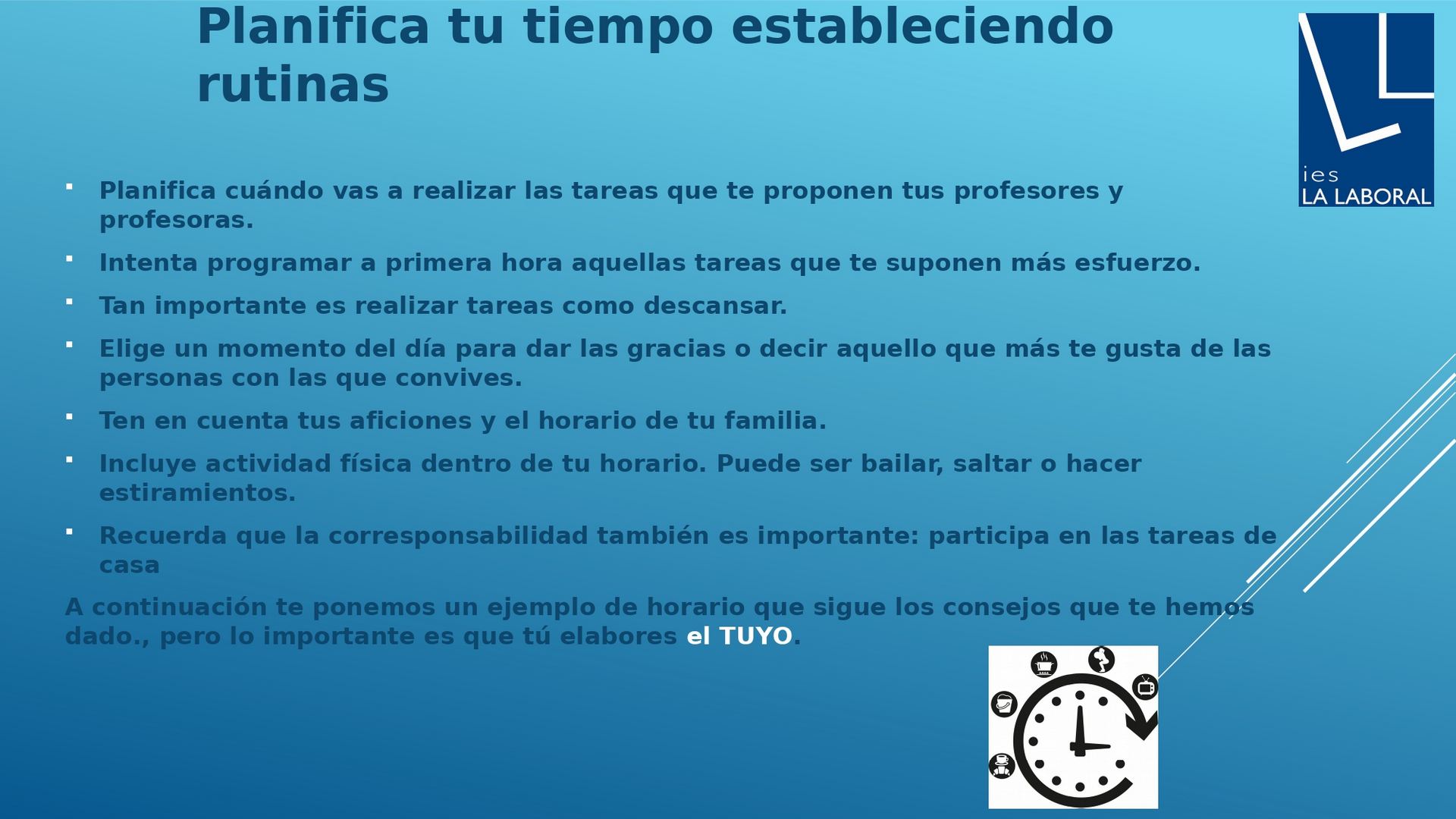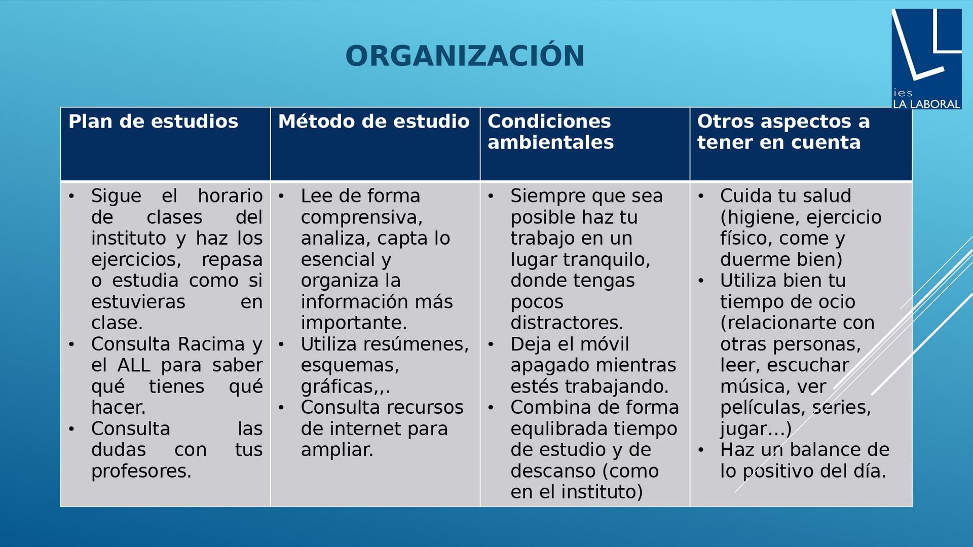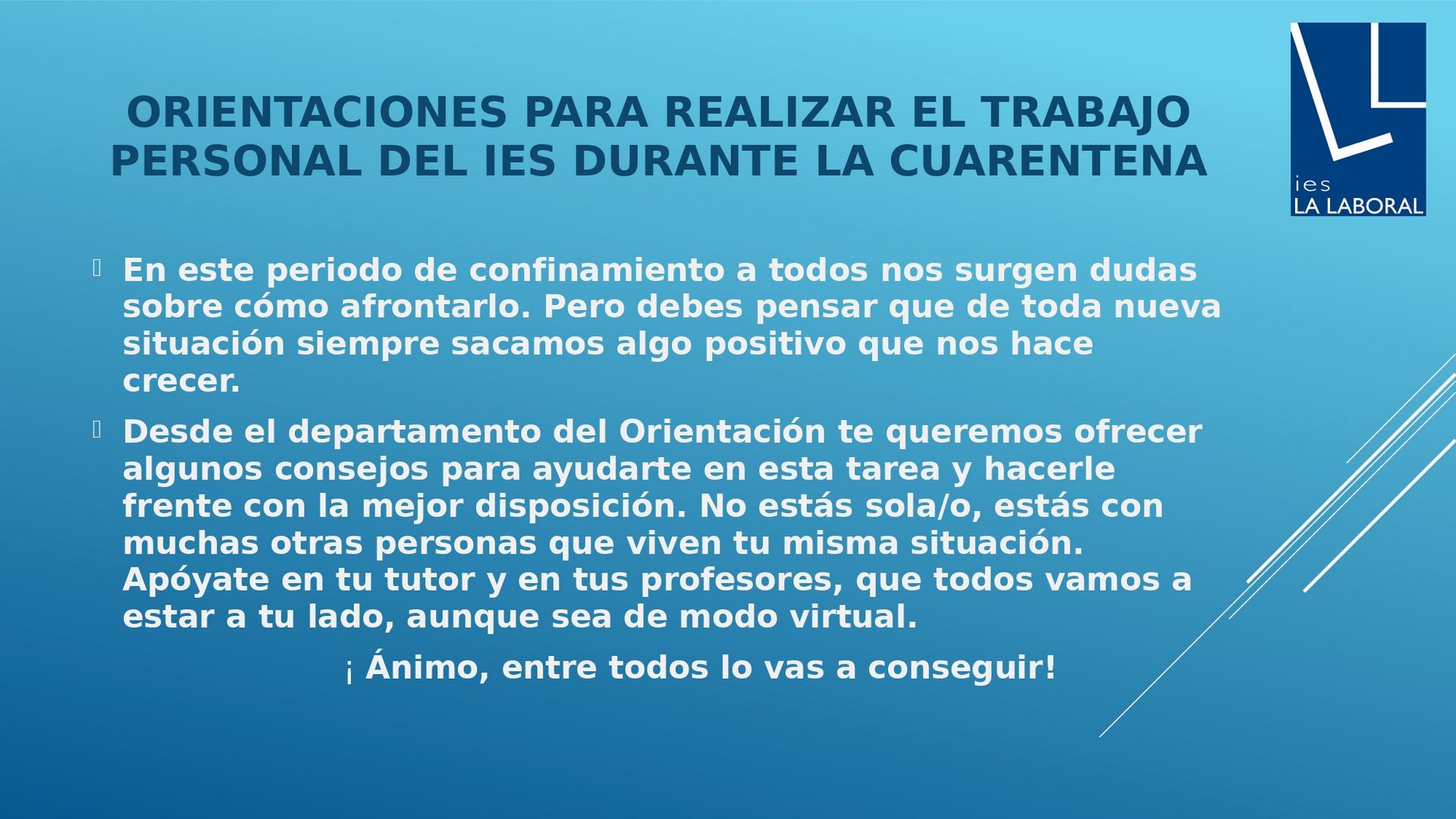 Desde el instituto queremos ayudarte y acompañarte en esta nueva situación. Queremos que sepas que no estás solo/a y que, cuando estés confuso/a y no sepas qué hacer, puedes apoyarte en tu tutor/a y en tus profesores. Te ofrecemos unos consejos que ha elaborado el Departamento de Orientación y que te pueden resultar útiles. Léelos con atención y ponlos en práctica.