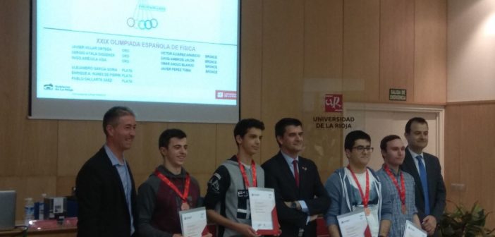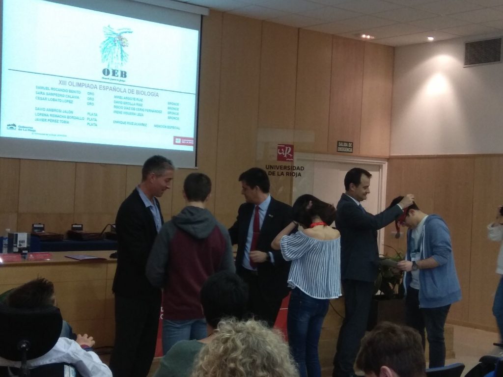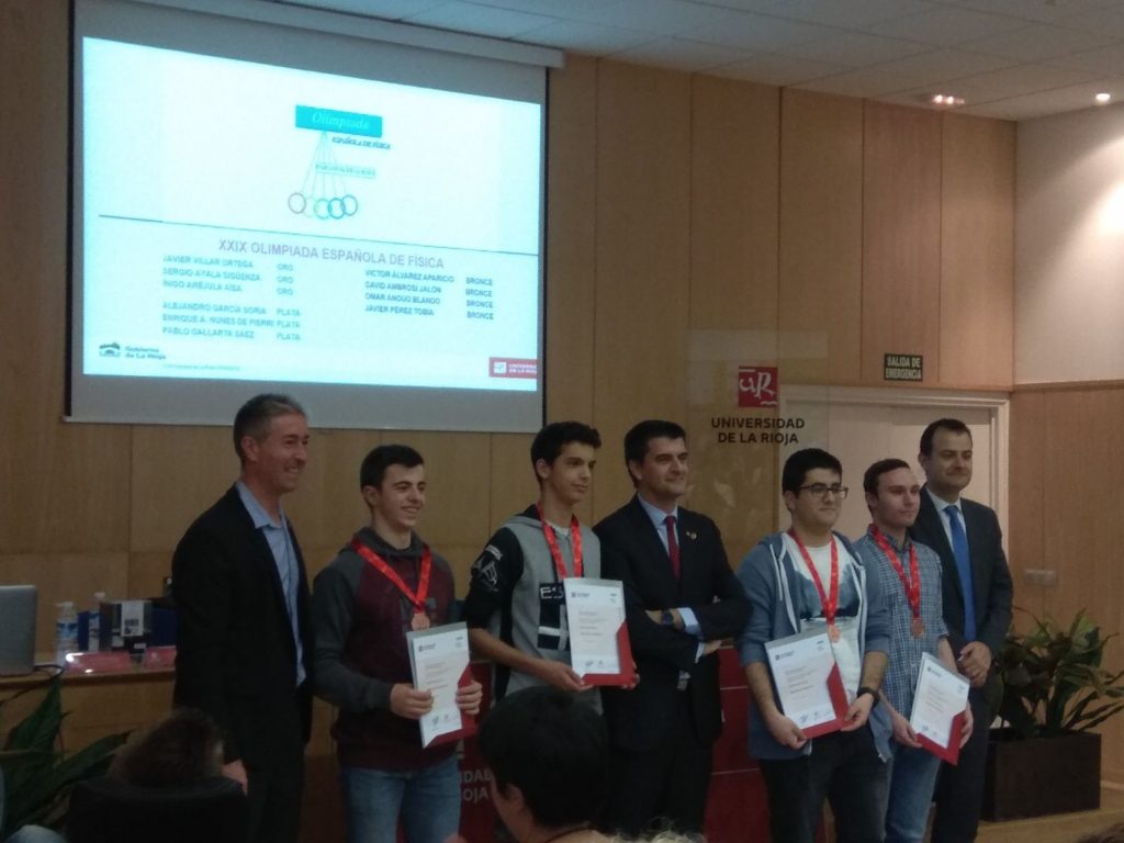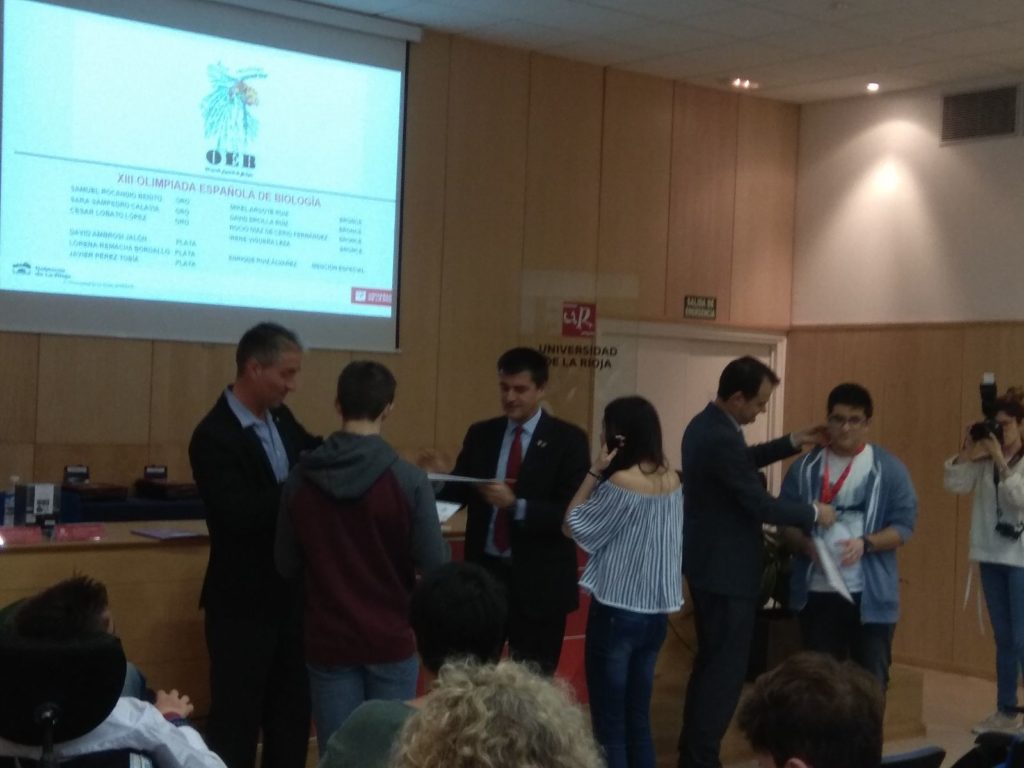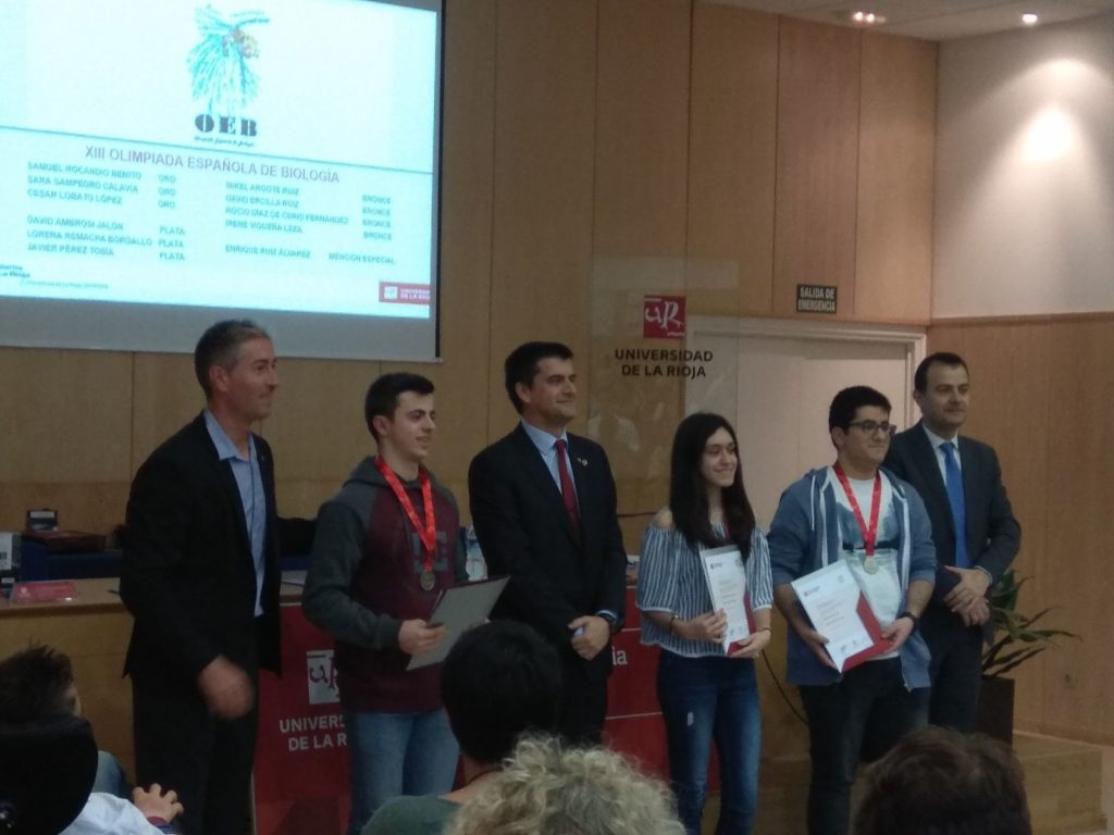 El Aula Magna del Complejo Científico-Tecnológico ha acogido el acto de entrega de menciones a los ganadores de las Olimpiadas de Ciencias 2018 -en las que han participado 358 estudiantes de Enseñanzas Medias de La Rioja-, organizado por la Facultad de Ciencia y Tecnología de la Universidad de La Rioja. Nuestro alumno de 2º de Bachillerato, David Ambrosi, ha recogido la medalla de bronce en Física y la de plata en Biología.
