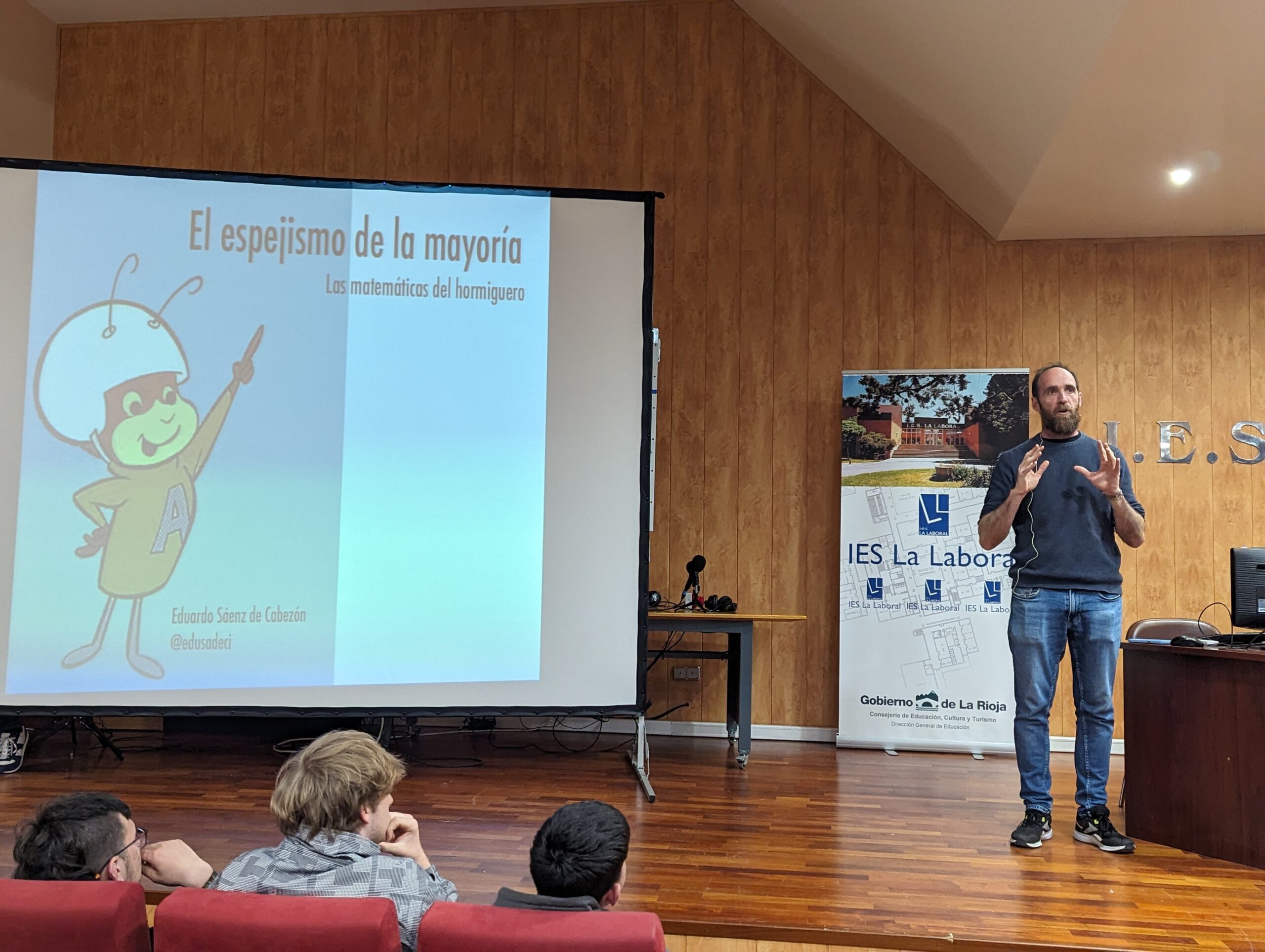 Eduardo ha concedido una entrevista a nuestros periodistas del Club de Radio La Laboral 2.0 del PIE Almazuela 2.0 y posteriormente ha impartido una conferencia titulada «El espejismo de la mayoría. Las matemáticas del hormiguero», en la que ha explicado conceptos matemáticos aplicados a las redes sociales y cómo las conexiones que se establecen en estas influyen en la formación de opiniones que se creen mayoritarias.