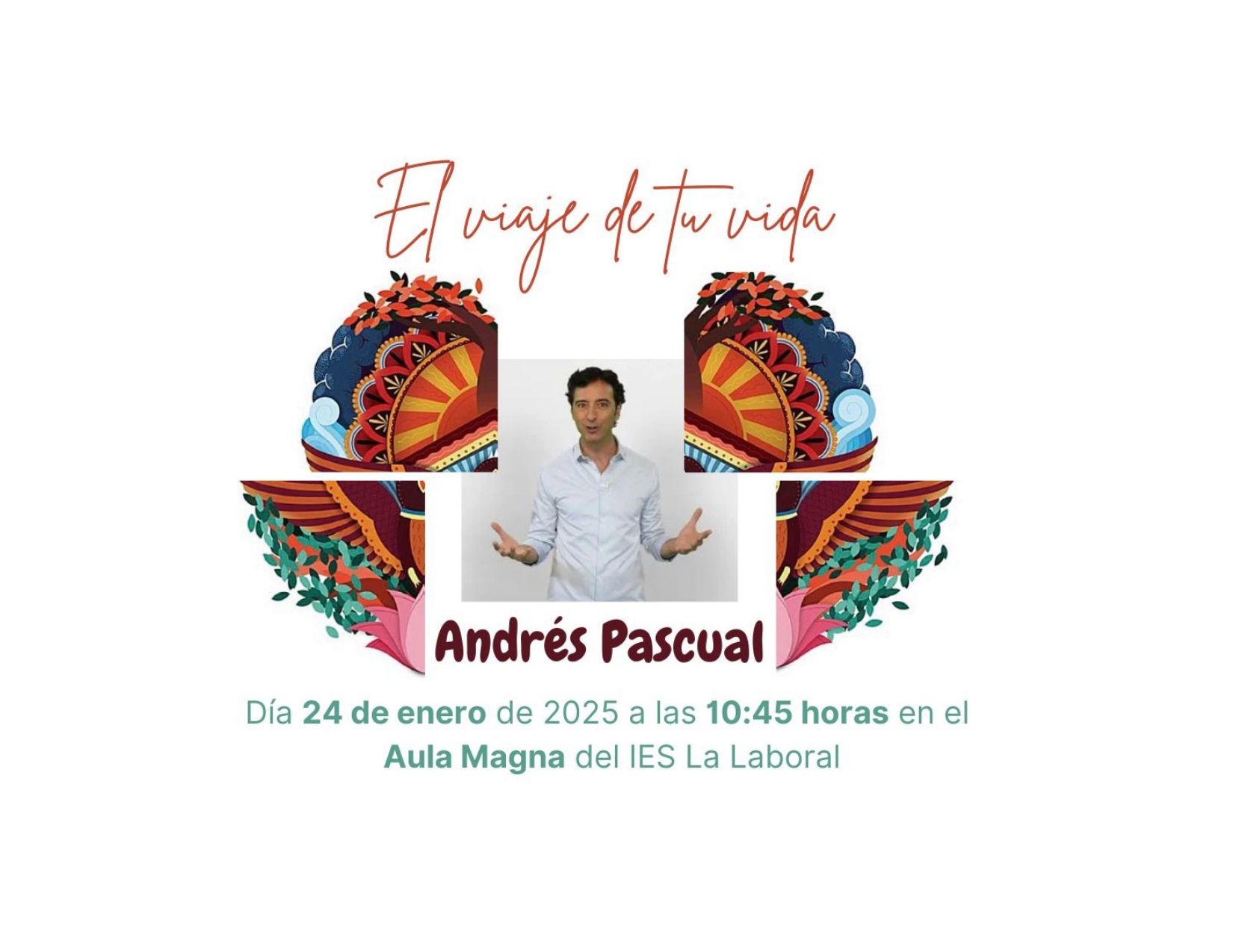 El escritor Andrés Pascual impartirá en el IES La Laboral la conferencia “El viaje de tu vida”. Será otro de los actos programados para celebrar el cincuenta aniversario de nuestro centro educativo.