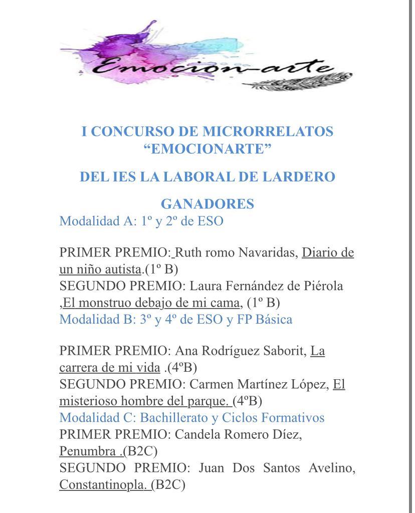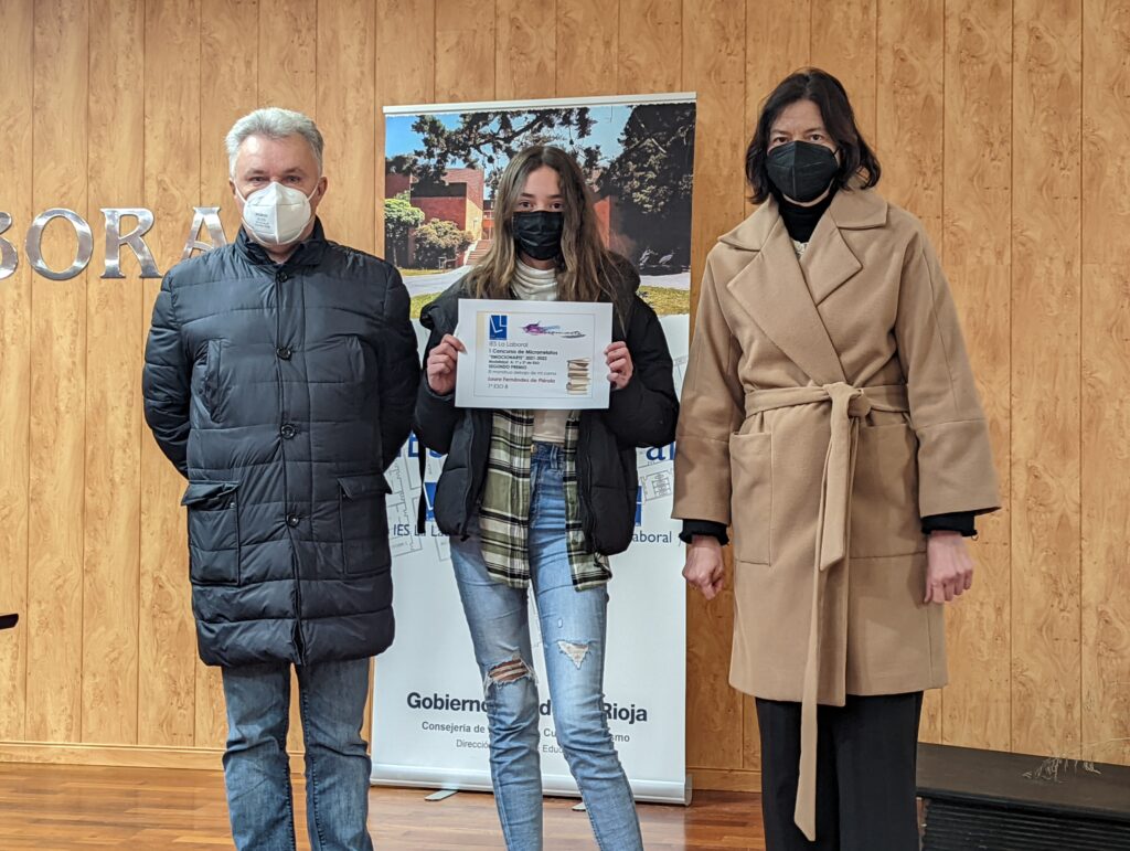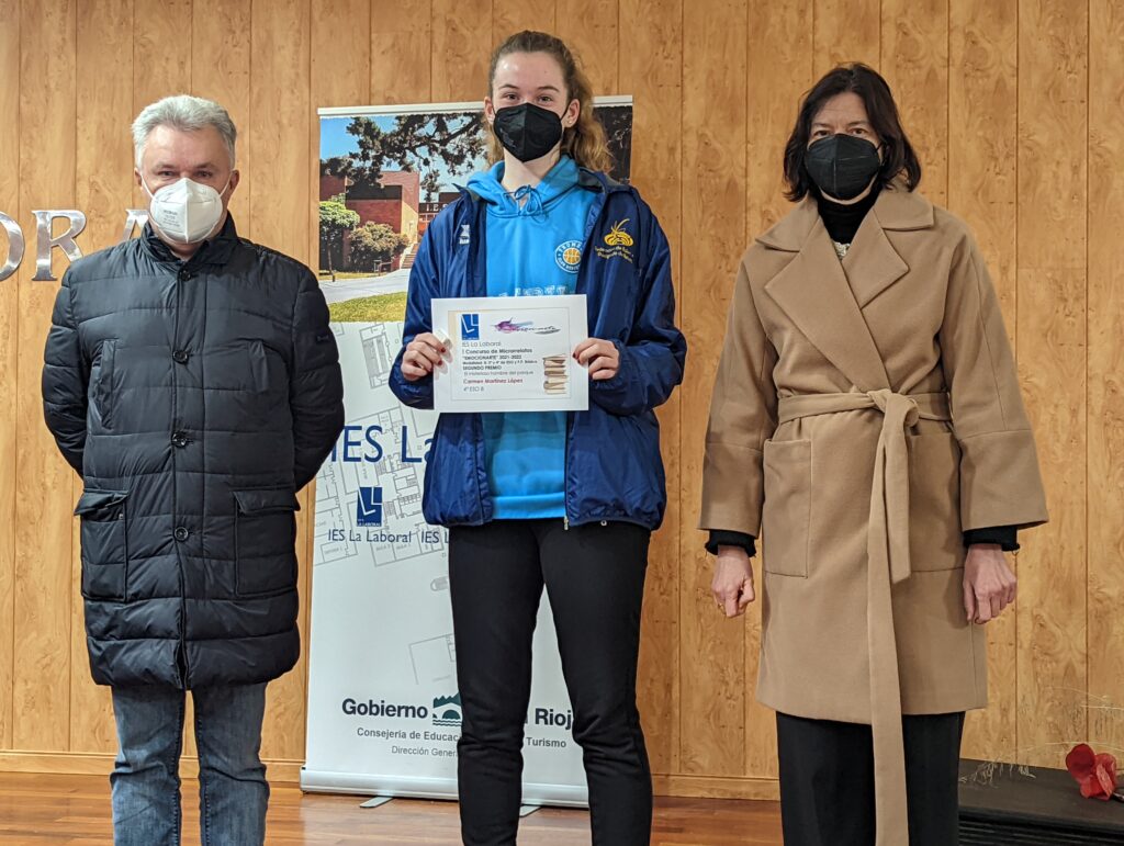 Ayer 2 de febrero tuvo lugar en el Salón de Actos del centro la entrega de premios a los ganadores del I Concurso de Microrrelatos «Emocionarte», organizado por el Departamento de Lengua y Literatura. Los diplomas fueron entregados por nuestro Director, Roberto Castellanos, y la Jefa del Departamento de Lengua y Literatura, Ana Moraga.