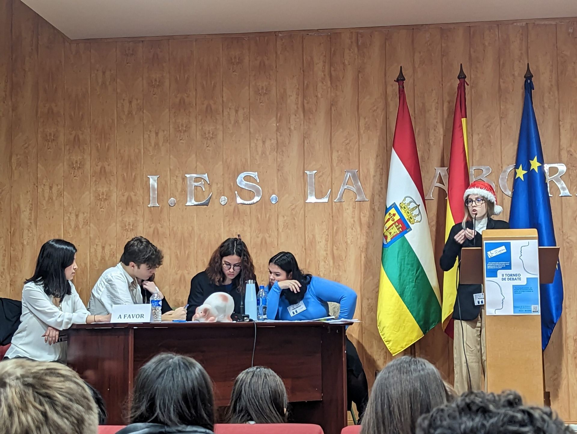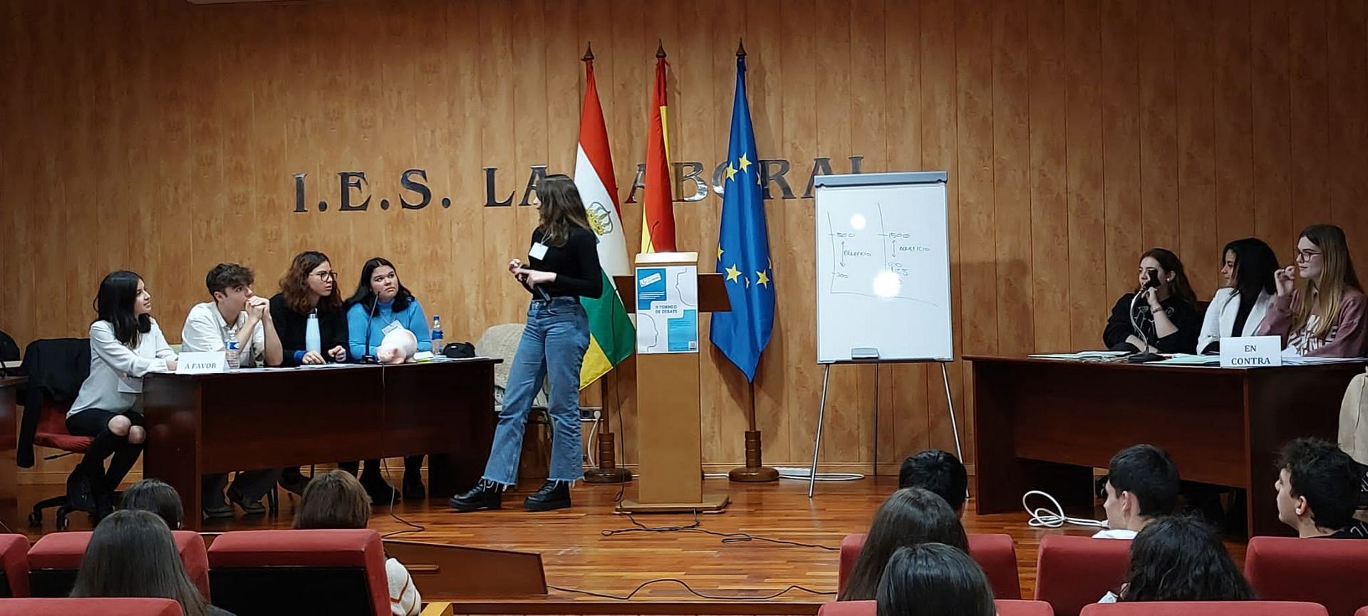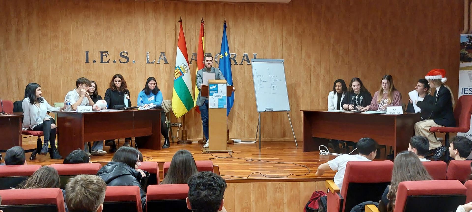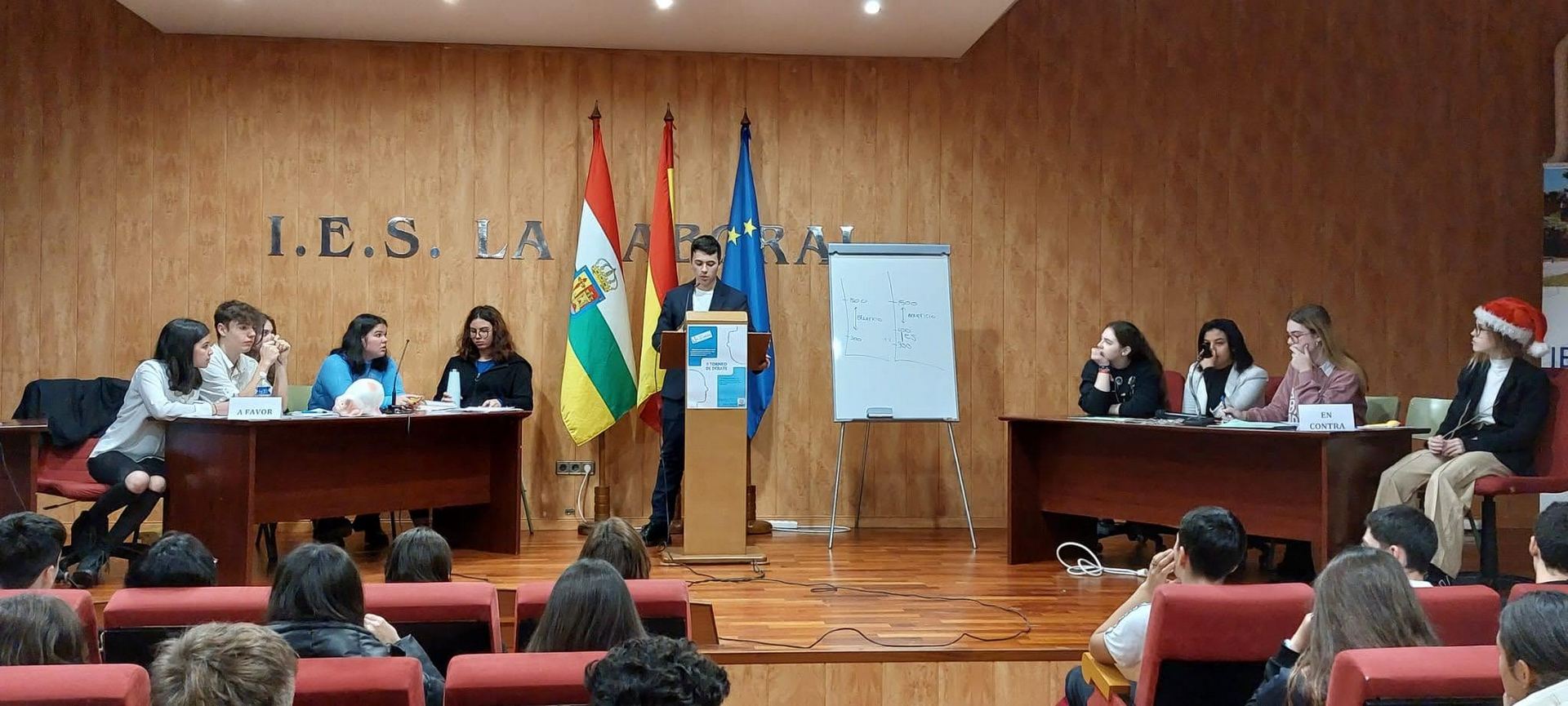 El pasado viernes 23 de diciembre se celebró en el Salón de Actos del instituto la GRAN FINAL del «II Torneo de Debate IES La Laboral», con el aforo del Aula Magna completamente lleno para presenciar el duelo dialéctico entre los dos equipos finalistas: los representantes de 1º de Bachillerato A contra el grupo de Oratoria I.
