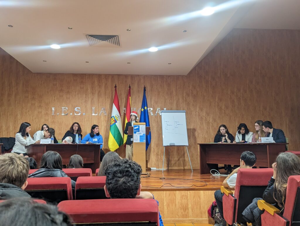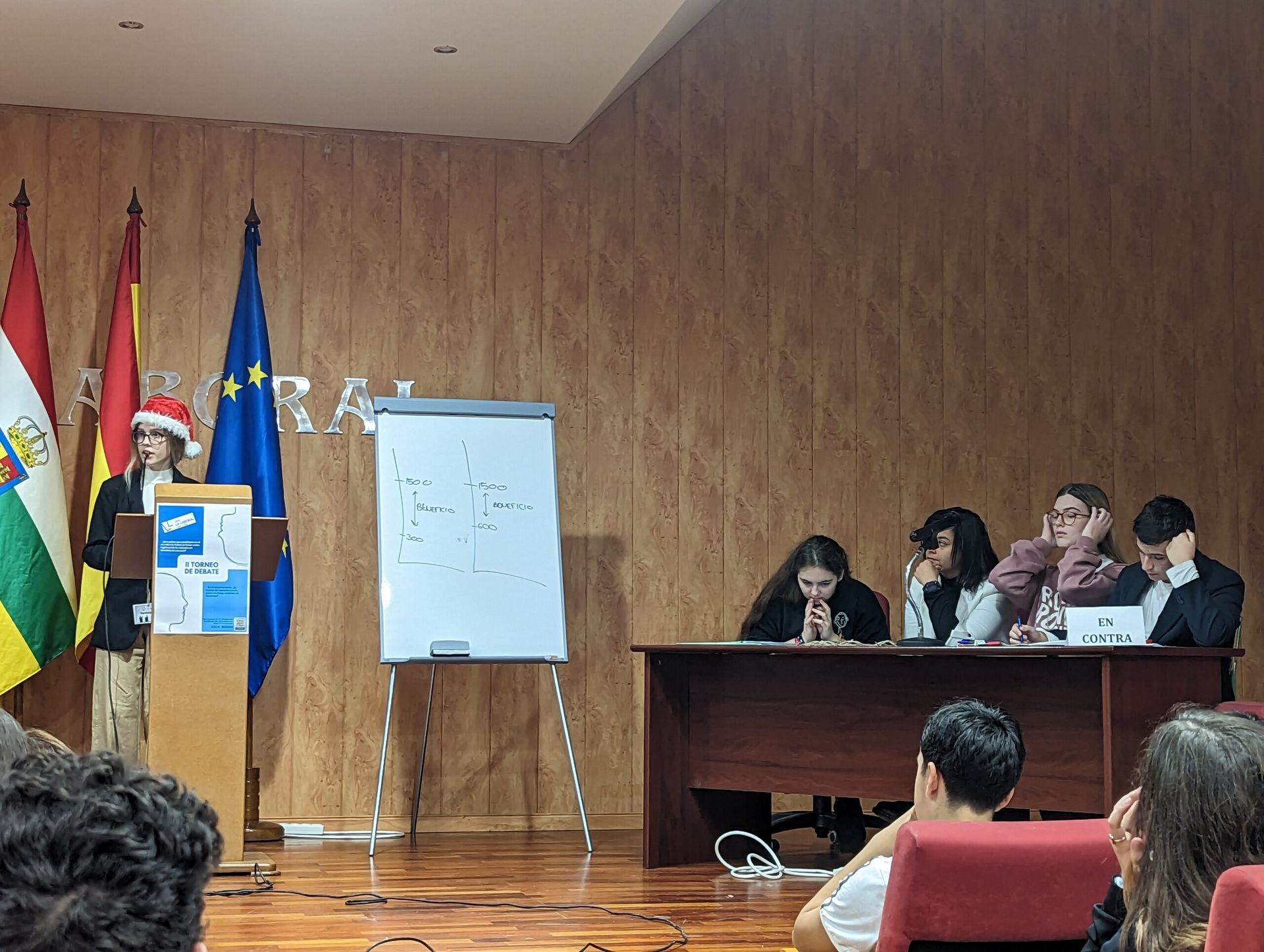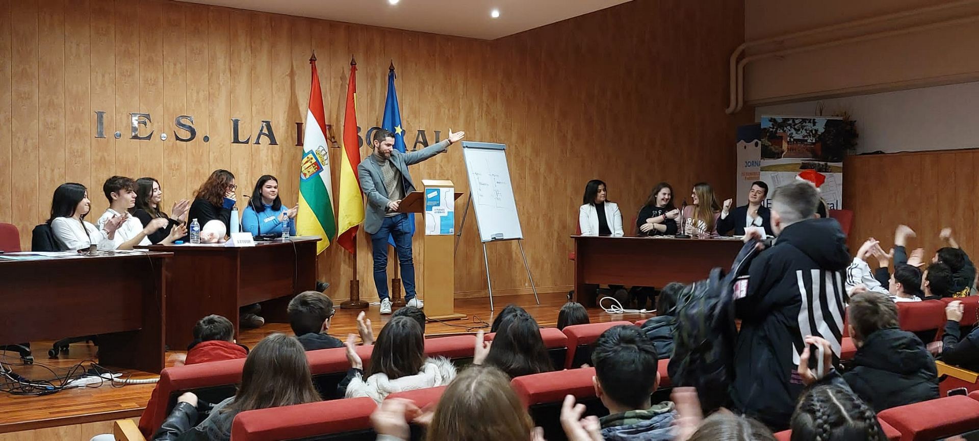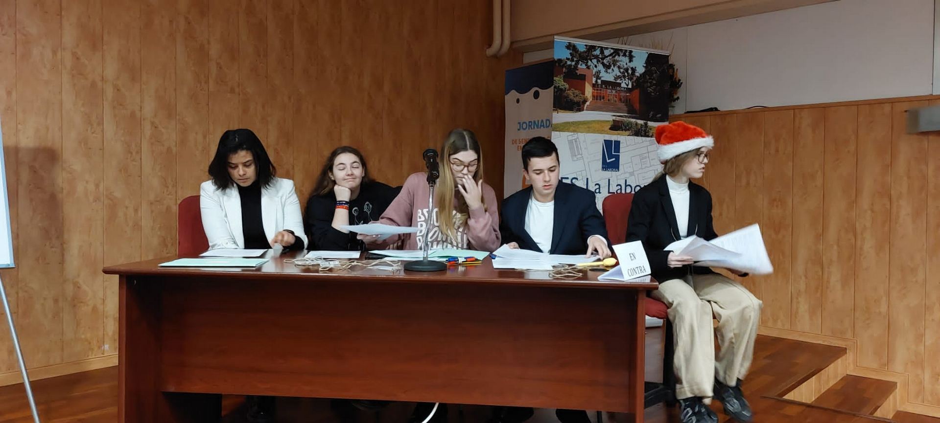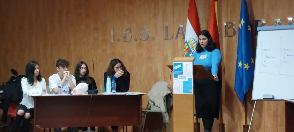 El pasado viernes 23 de diciembre se celebró en el Salón de Actos del instituto la GRAN FINAL del «II Torneo de Debate IES La Laboral», con el aforo del Aula Magna completamente lleno para presenciar el duelo dialéctico entre los dos equipos finalistas: los representantes de 1º de Bachillerato A contra el grupo de Oratoria I.