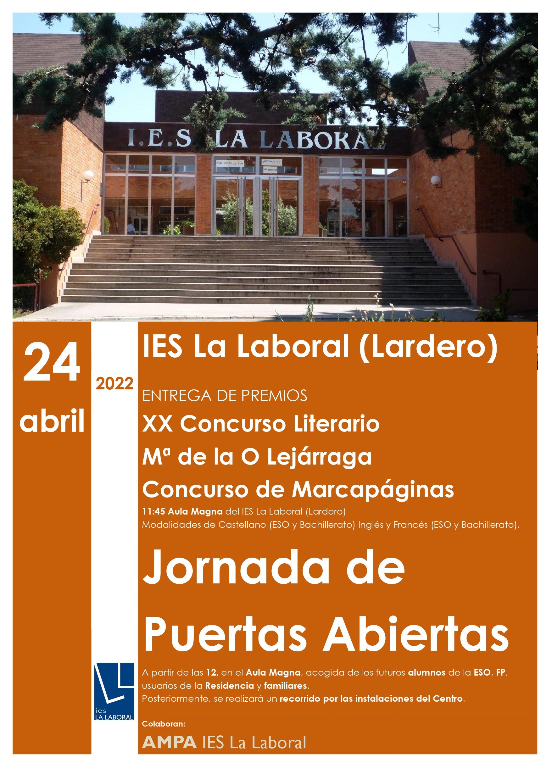 Jornada de puertas abiertas: 24 de abril 13 abril, 2022 El domingo 24 de abril celebraremos la entrega de premios literarios María de la O Lejárraga y del Concurso de Marcapáginas a las 11:45 horas y la Jornada de Puertas Abiertas a las 12 de la mañana. ¡Os esperamos! Twitter. Facebook Google+ Pinterest LinkedIn. Tumblr Correo electrónico