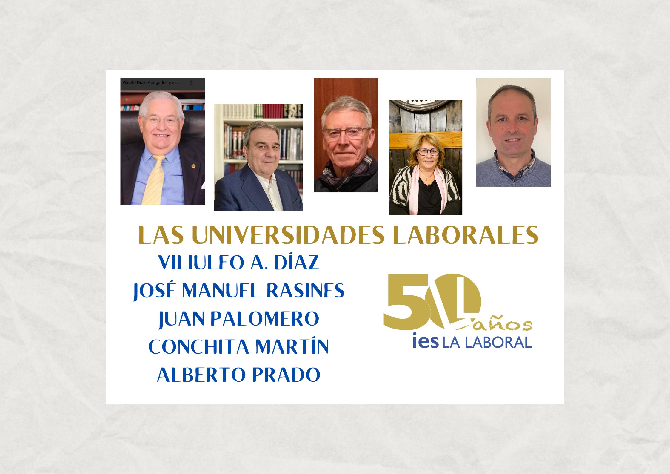 El programa de celebración del 50 aniversario del IES La Laboral quedaría incompleto sin dedicar a una sesión a las Universidades Laborales: su origen, su función social, sus logros y su evolución histórica. Para abordar este tema ineludible para nuestra comunidad educativa, hemos programado un acto-coloquio en el que participarán personalidades cuya trayectoria ha estado vinculada con las Universidades Laborales.