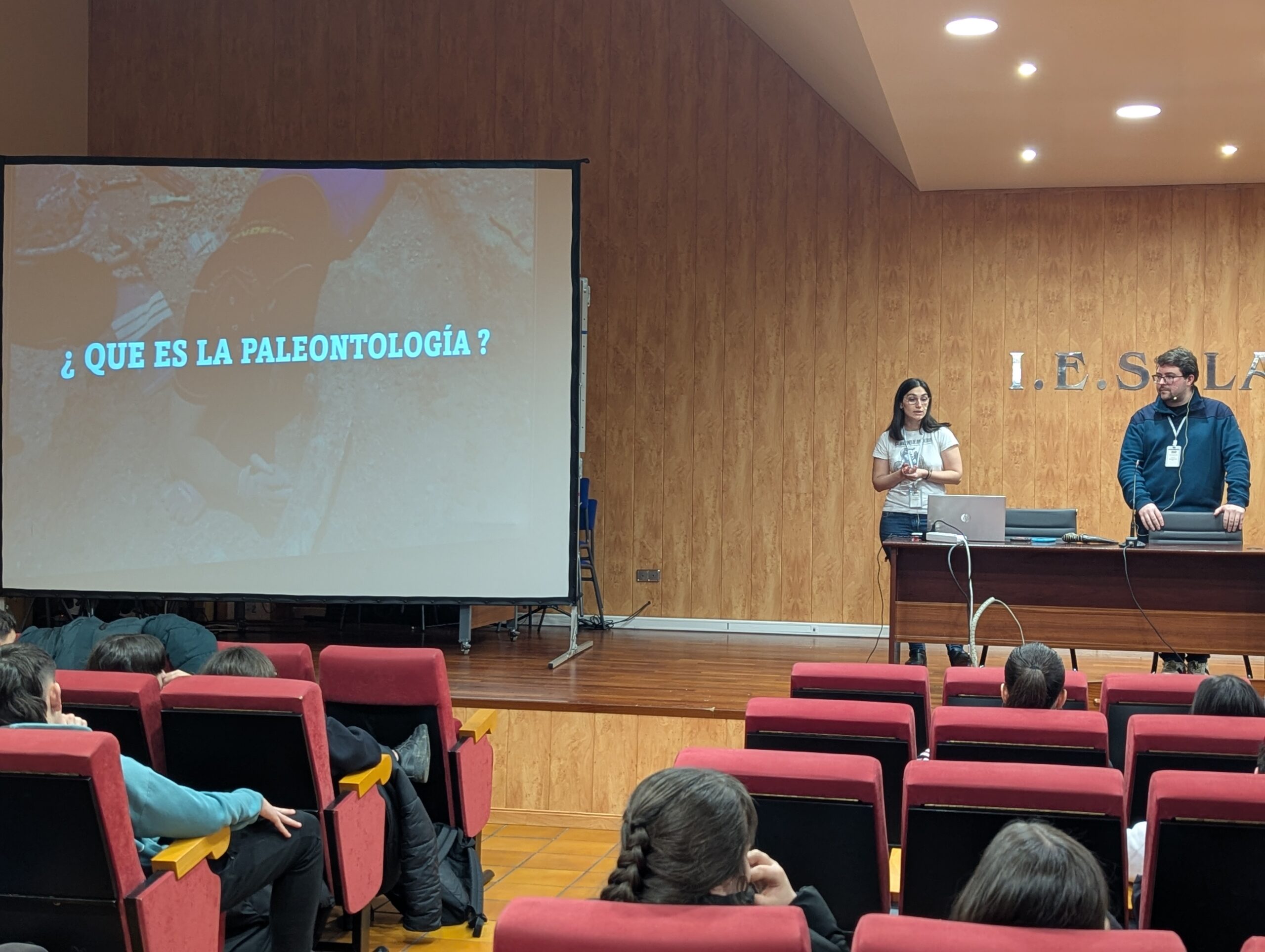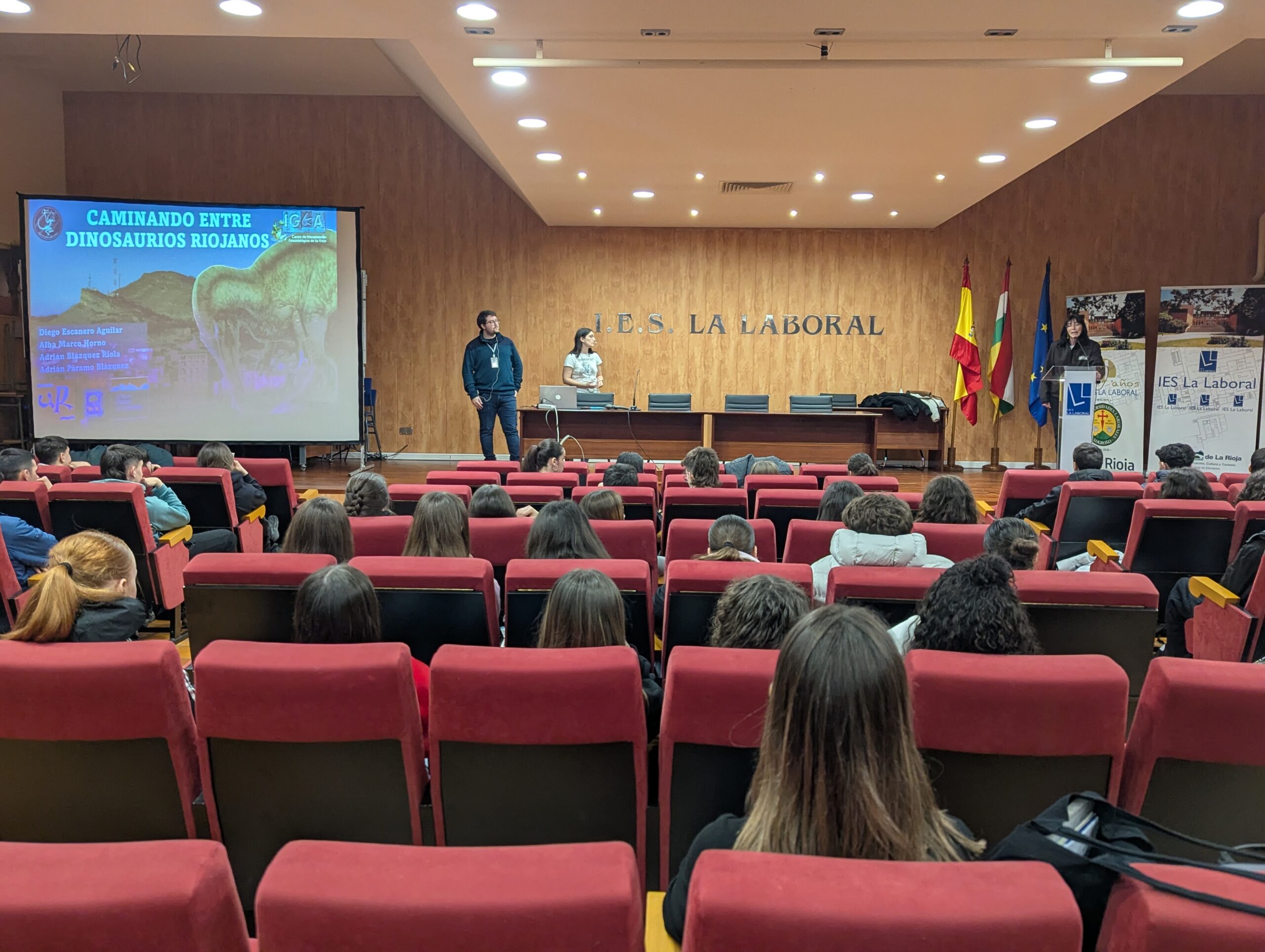 Por otro lado, el paleontólogo Adrián Blázquez y la restauradora Alba Marco han dirigido una charla a los alumnos de 4º de la ESO que cursan la asignatura de Biología y Geología en el Aula Magna. En la misma han hablado de los principales yacimientos fósiles de dinosaurios de La Rioja. Ha sido especialmente interesante la parte en la que nos han explicado las técnicas convencionales y de última generación para estudiar a estos fantásticos seres.
