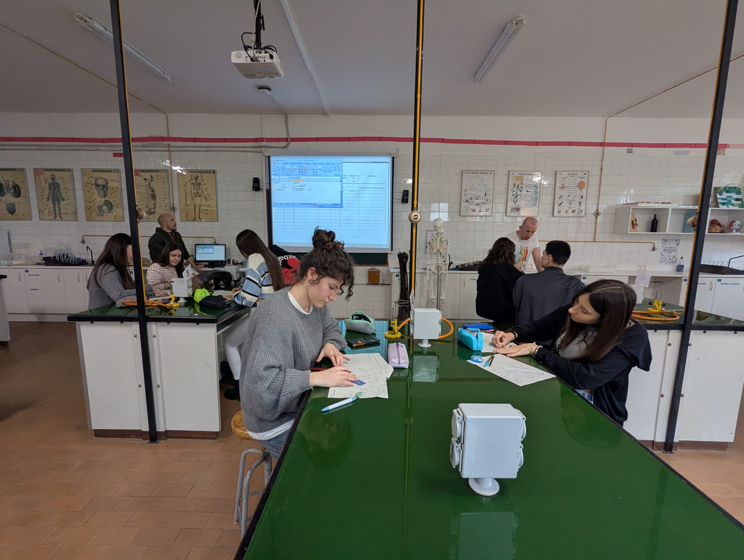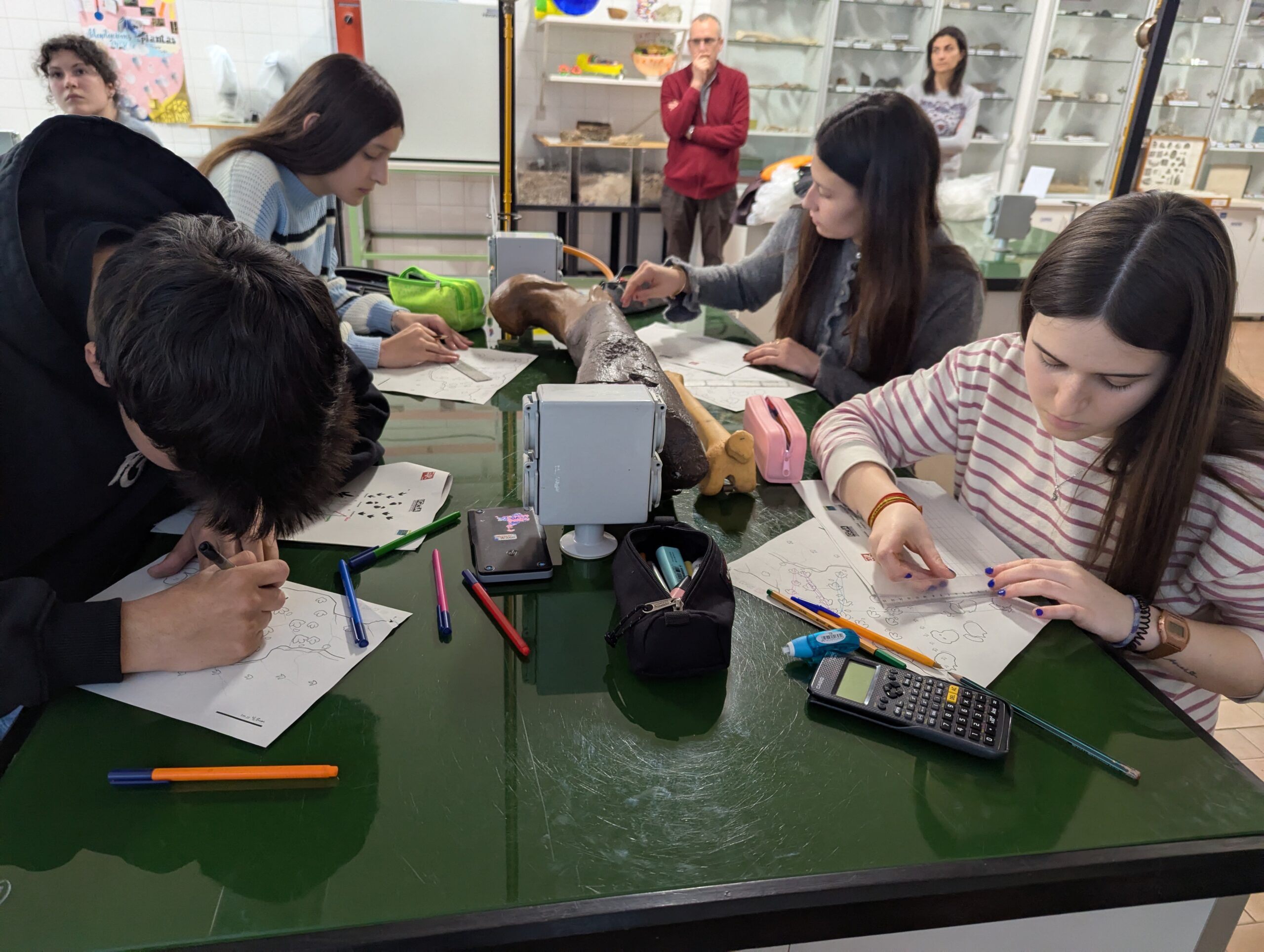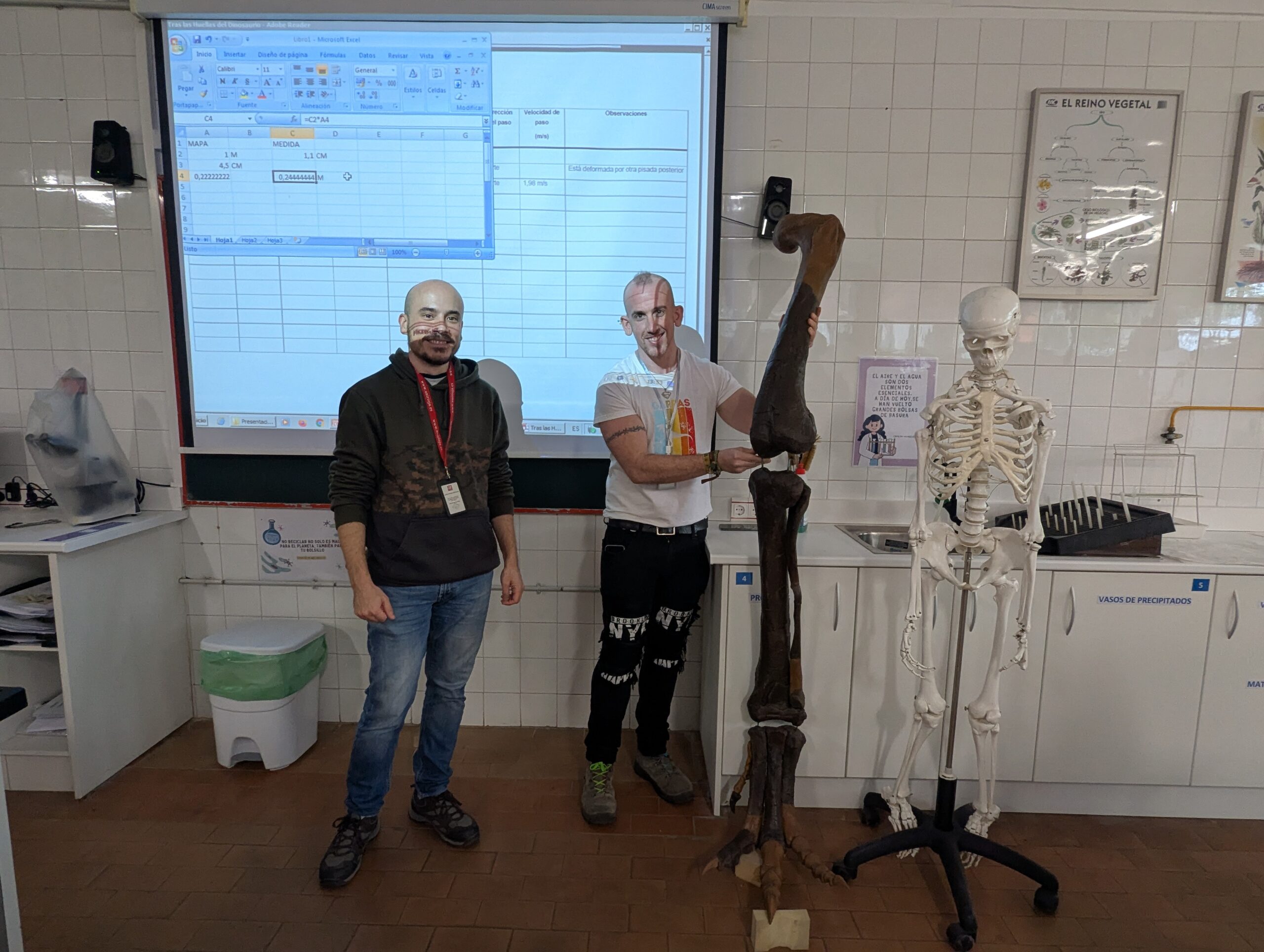 Por un lado, los paleontólogos Adrián Páramo y Diego Escanero han impartido un Taller de Paleontología dirigido a los alumnos de Geología de 2º de Bachillerato en el Laboratorio de Biología y Geología. En el mismo, hemos podido aprender de primera mano las técnicas que se utilizan para analizar las icnitas de dinosaurios, diferenciarlas, hacer cálculos anatómicos, velocidad de movimientos, etc. También nos han traído una réplica de los huesos de la extremidad trasera de Riojavenatrix Palustris, especie de dinosaurio terópodo descrita a partir de los huesos encontrados en el yacimiento Virgen del Villar de Igea, y compararlos con el tamaño del esqueleto humano que hay en el laboratorio.
