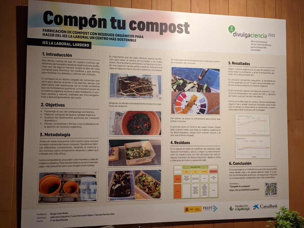 «Compón tu compost» es un trabajo sobre la elaboración de compost casero realizado por Julia Amo, Lucía Hernando y Samuel Ilarraza, de 2º de Bachillerato. Tenéis la explicación de todo el proceso de investigación en esta web que han elaborado: