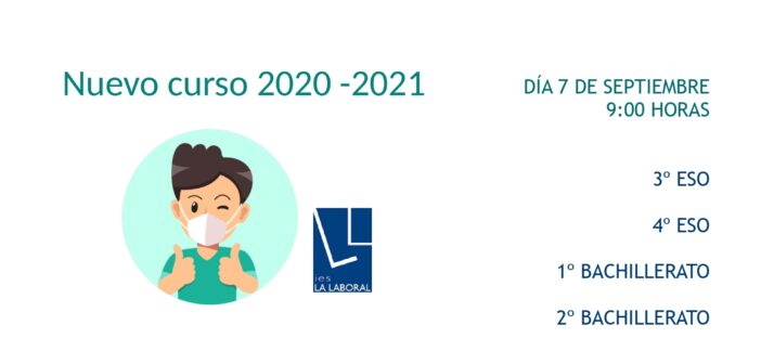 Empezamos la presentación del curso el día 7 a las 9:00 horas para los cursos detallados más abajo. Cuando accedáis al centro debéis dirigiros al aula que os corresponda, guardando siempre la distancia de seguridad y portando una mascarilla correctamente colocada (cubriendo nariz y boca). Durante las dos primeras horas de la jornada estaréis atendidos por vuestros tutores y después comenzarán las clases hasta el final de la mañana. NO debéis volver hasta el jueves 10 de septiembre, cuando se iniciarán las clases normales siguiendo el protocolo que os expliquen vuestros tutores.