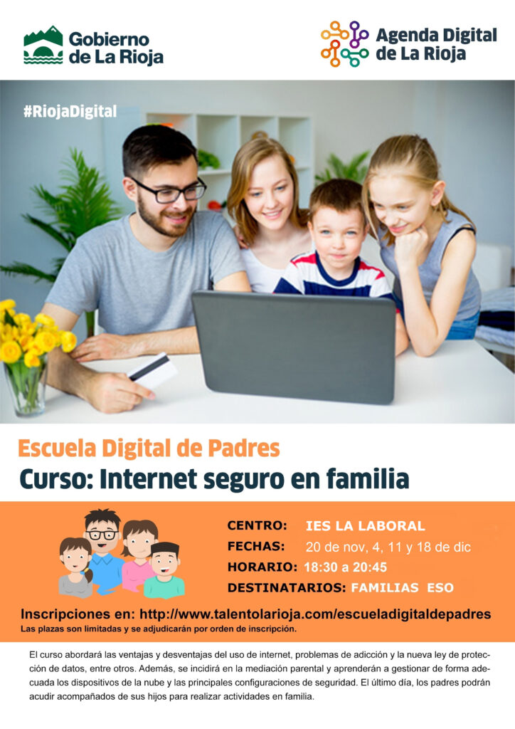 Esta iniciativa, que se enmarca dentro de la Agenda Digital riojana, busca dotar a los padres de las herramientas necesarias para, para por un lado, reducir la brecha digital con sus hijos, y por otro, que puedan ayudarles a hacer un uso responsable y seguro de la red.