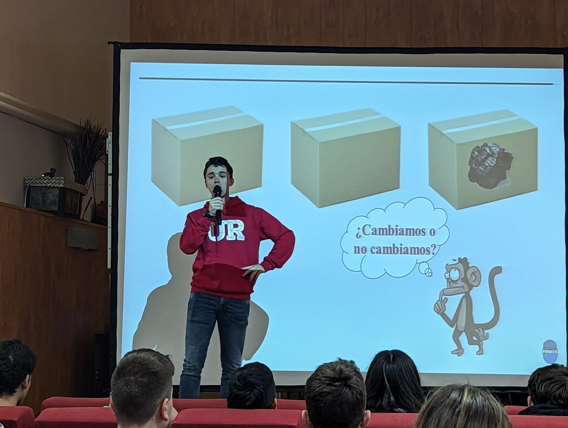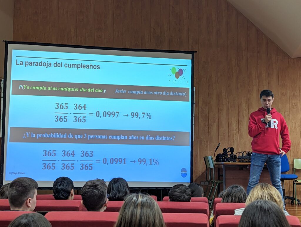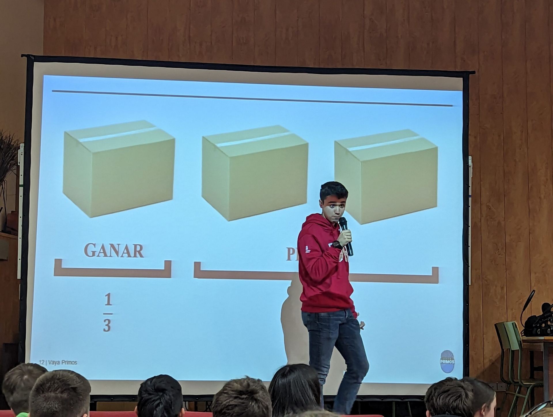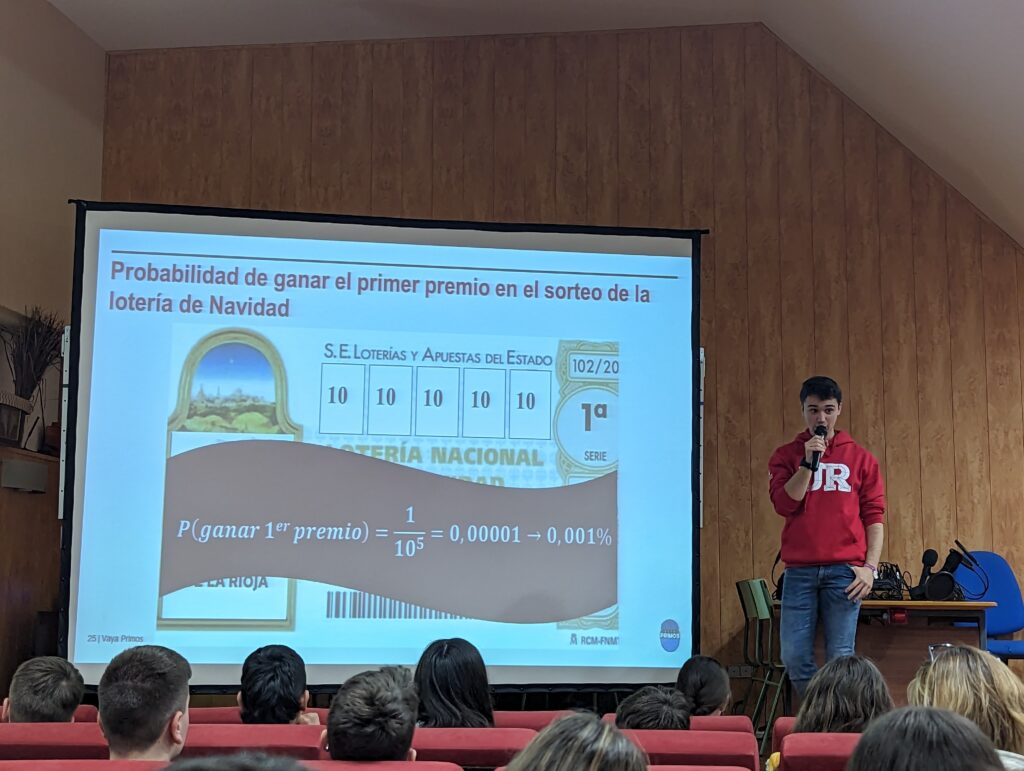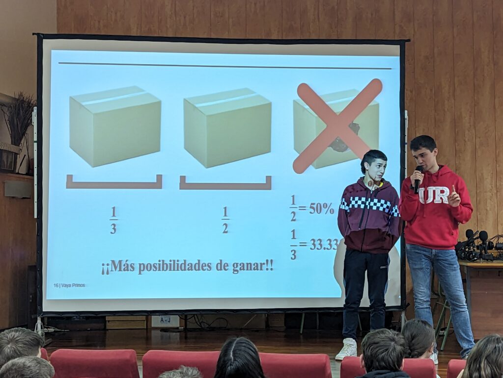 Todos los alumnos de 3° de ESO han asistido al Aula Magna para presenciar la charla matemática de “Vaya Primos”, un grupo de estudiantes universitarios del Grado en Matemáticas de la Universidad de La Rioja que se dedican a realizar charlas divulgativas para acercarnos las matemáticas a situaciones y ejemplos de la vida cotidiana.