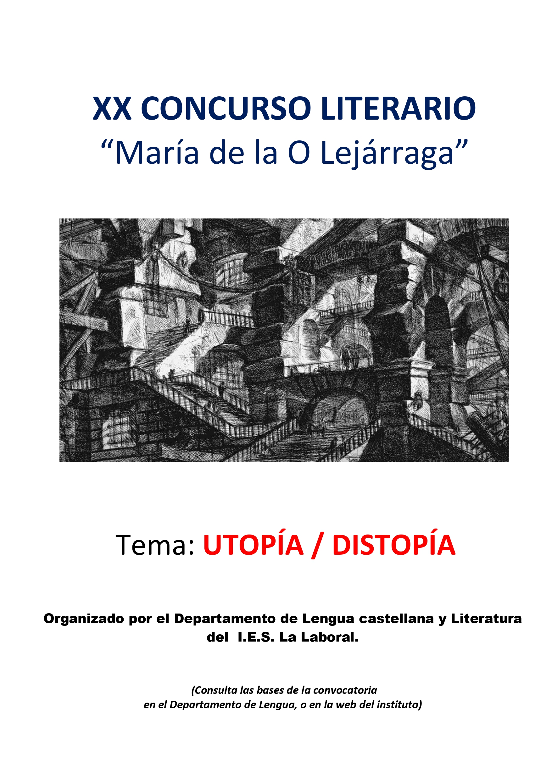 XX Concurso Literario María de la O Lejárraga 20 enero, 2022 Ya está convocado el XX Concurso Literario María de la O Lejárraga. Tenéis las bases para presentaros a continuación. CONCURSANTES Modalidad A: 1º y 2º de ESO Modalidad B: 3º y 4º de ESO y FP Básica Modalidad C: Bachillerato y Ciclos Formativos El trabajo (relato literario), versará sobre uno de los siguientes temas: «Utopía» / «Distopía». Estos se presentarán redactados en lengua castellana y su extensión no excederá de 10 de folios a una cara, en Arial 12 y a doble espacio. FECHA DE PRESENTACIÓN El plazo de entrega finalizará el día 28 de marzo de 2022. PREMIOS El jurado concederá los siguientes premios en cada modalidad: * Primer premio (100 euros en valor de libros y diploma) * Segundo premio (75 euros en valor de libros y diploma) El FALLO DEL JURADO se comunicará en la página web del centro. Bases completas Twitter. Facebook Google+ Pinterest LinkedIn. Tumblr Correo electrónico